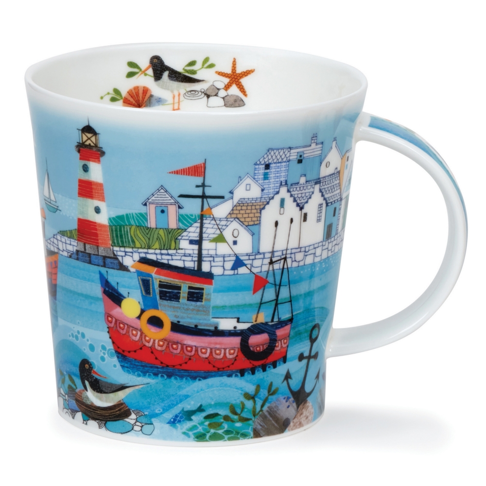 Dunoon fine bone china mugs are handcrafted in Staffordshire, England. They are produced to the highest quality using traditional methods which have been developed and refined over 3 family generations in the pottery industry. Holding a whopping 750ml, this jumbo mug is made out of our light fine bone china and a delight to use. A much bigger version of our bestselling Cairngorm shape, Benmore will be one of the largest bone china mugs available on the market whilst retaining the fine, light quality which our discerning customers expect. A bright coastal illustration capturing a lively harbour scene, with cheerful fishing boats, playful coastal birds and a proud lighthouse standing watch happily, all in bright sea-blue shades.