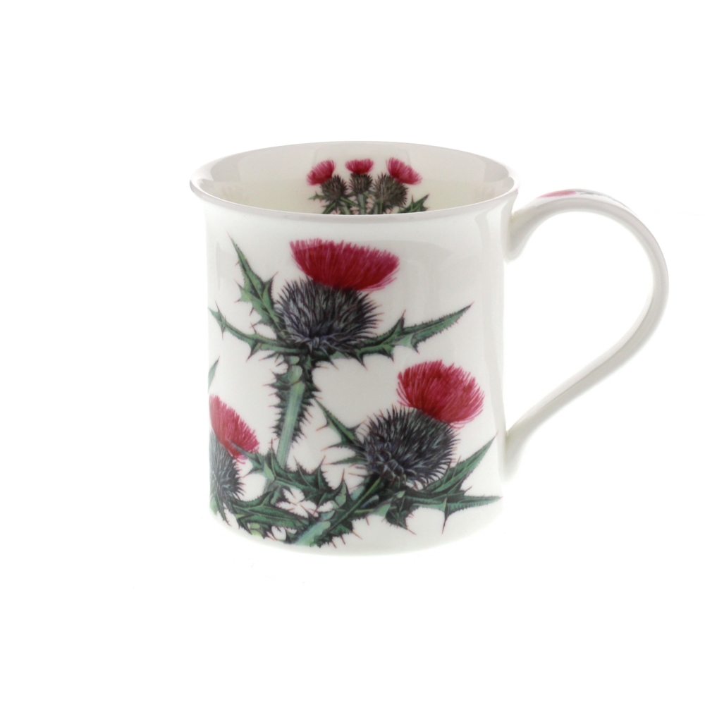 Dunoon fine bone china mugs are handcrafted in Staffordshire, England. They are produced to the highest quality using traditional methods which have been developed and refined over 3 family generations in the pottery industry The Bute shape holds 0.3l and is a traditional straight sided mug with a flare at the top. The comfortable handle makes it easy to hold. With eye-catching purple heads and a prickly body, this thistle is beautifully drawn by botanical artist, Kathy Pickles.