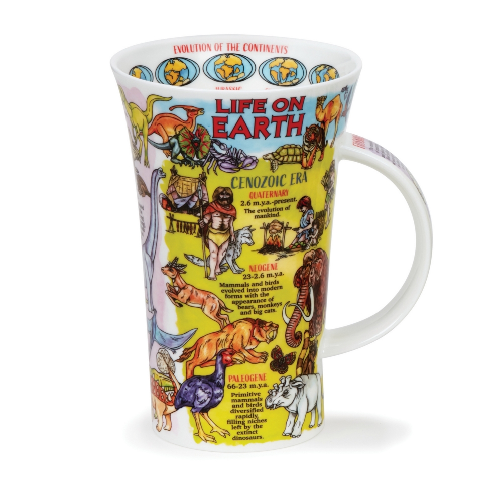 Dunoon fine bone china mugs are handcrafted in Staffordshire, England. They are produced to the highest quality using traditional methods which have been developed and refined over 3 family generations in the pottery industry. This oversized mug, named after one of the greatest Glens in Scotland 'Glencoe', is one of our oldest shapes, yet remains one of our most striking. It has a great presence and our informative and educational patterns have remained the most popular designs on this shape. It has a flared top and a strong, comfortable handle so it feels very solid to hold. From the Pre-Cambrian period, 4600 million years ago, take a journey through time as we explore the evolution of the Earth and its inhabitants, all the way to the present day