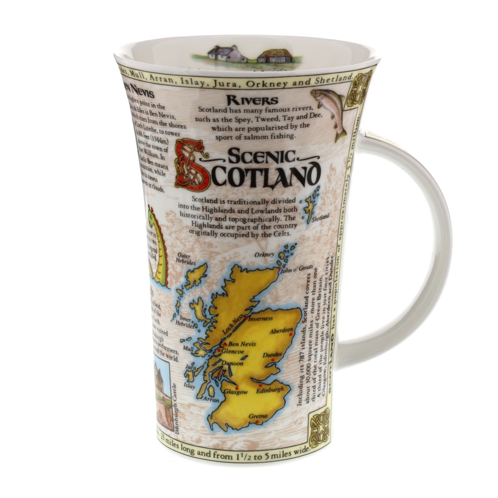 Dunoon fine bone china mugs are handcrafted in Staffordshire, England. They are produced to the highest quality using traditional methods which have been developed and refined over 3 family generations in the pottery industry. This oversized mug, named after one of the greatest Glens in Scotland 'Glencoe', is one of our oldest shapes, yet remains one of our most striking. It has a great presence and our informative and educational patterns have remained the most popular designs on this shape. It has a flared top and a strong, comfortable handle so it feels very solid to hold. Learn all about Scenic Scotland with this informative mug by Jackie Reynolds. Featuring outstanding natural locations such as Ben Nevis and Loch Ness, this mug also incorporated some of the iconic man-made landmarks which include the Forth Bridge and Balmoral.