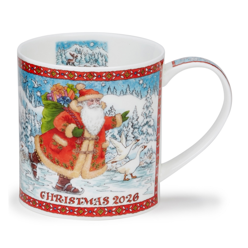Dunoon fine bone china mugs are handcrafted in Staffordshire, England. They are produced to the highest quality using traditional methods which have been developed and refined over 3 family generations in the pottery industry. Orkney is a modern, straight sided mug which lends itself to contemporary patterns. It has a strap handle making it very comfortable to use and holds 0.35L. This year a charming Santa with a big snowy beard takes centre stage, happily skating on his way with a sack packed full of gifts to deliver to everyone who's been good this year! All set against an icy blue background with snow laden trees and christmas geese, beautifully edged in snowflakes and a red trim for the perfect Christmas scene