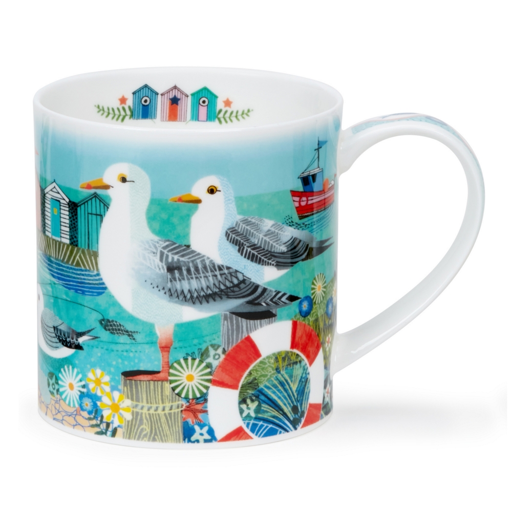Dunoon fine bone china mugs are handcrafted in Staffordshire, England. They are produced to the highest quality using traditional methods which have been developed and refined over 3 family generations in the pottery industry. Orkney is a modern, straight sided mug which lends itself to contemporary patterns. It has a strap handle making it very comfortable to use and holds 0.35L. A celebration of the mischevious seagull happily standing watch along the sea front, set against a coastal background with a colourful boat and line of beach huts
