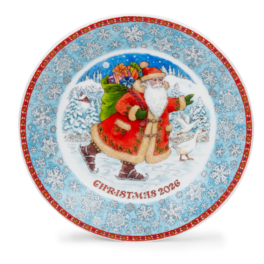 Dunoon fine bone china mugs and plates are handcrafted in Staffordshire, England. They are produced to the highest quality using traditional methods which have been developed and refined over 3 family generations in the pottery industry. This year a charming Santa with a big snowy beard takes centre stage, happily skating on his way with a sack packed full of gifts to deliver to everyone who's been good this year! All set against an icy blue background with snow laden trees and Christmas geese, beautifully edged in snowflakes and a red trim for the perfect Christmas scene