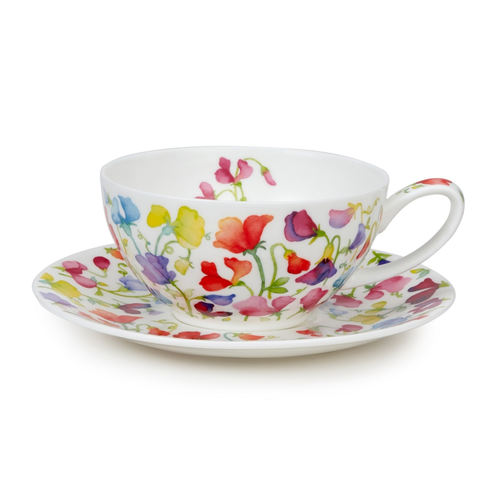 Dunoon fine bone china mugs are handcrafted in Staffordshire, England. They are produced to the highest quality using traditional methods which have been developed and refined over 3 family generations in the pottery industry. The Islay Cup and Saucer is a modern cup and saucer with straight sides, based on our popular Lomond and Cairngorm shapes. It has a comfortable handle and holds 0.35l. Ideal for a mid morning coffee break. The decoration on the saucers finishes each set off beautifullyWatercolour sweet peas in fresh, beautiful shades including pinks, reds and purples climb their way through each other, covering this cup and saucer from top to bottom with colour and vibrancy